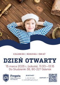 Zapraszamy na Dzień Otwarty w Szkole Podstawowej dla Chłopców Fregata – jedynej takiej placówce w Trójmieście. To wyjątkowa okazja, aby poznać naszą szkołę, zobaczyć, jak uczymy, i porozmawiać z nauczycielami.